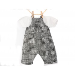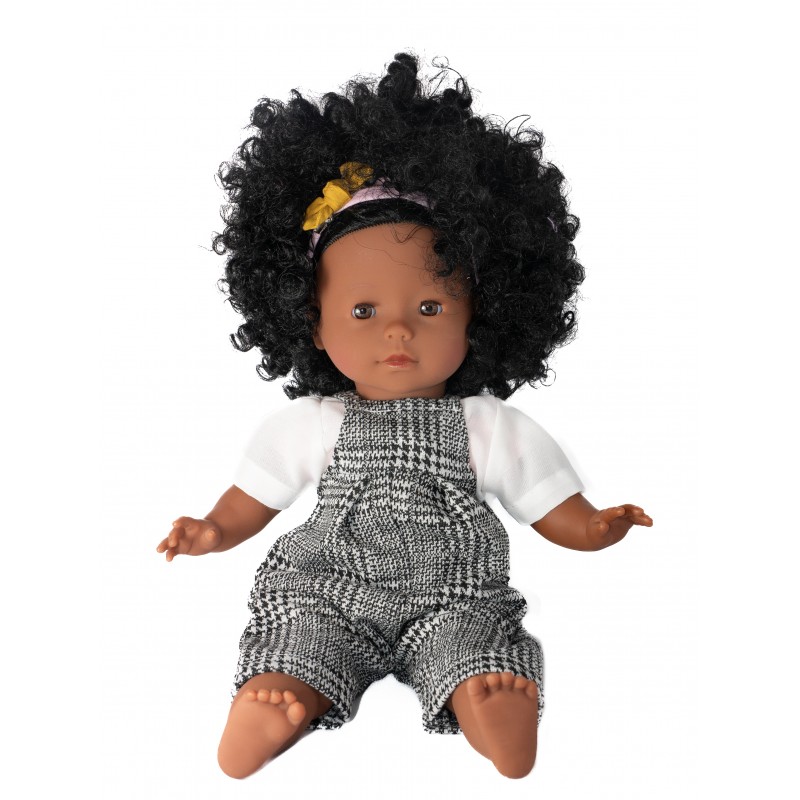 Poupée ma Corolle Métisse Brune, toute vêtue par OBI OBI : Salopette Noire et Blanche et son tee-shirt, ainsi que sa barrette jaune pour compléter la tenue.