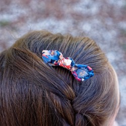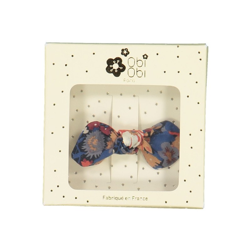 Barrette en véritable tissu Liberty Thorpe Burnt monté de type pince croco . Packaging : boite cadeau dorée à l'or chaud (dimension : 9 X 9 X 1,5cm). Fabrication française.