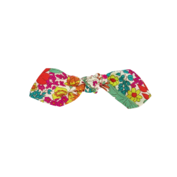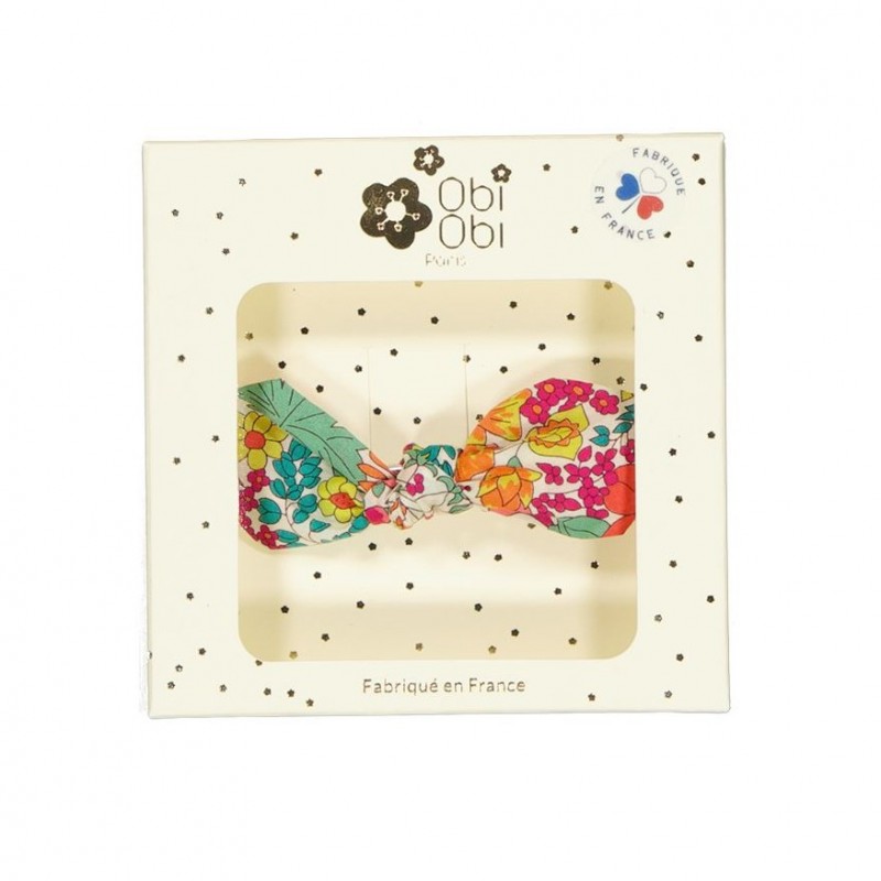 Jolie barrette noeud en liberty Margaret Rose Entierement conçue et cousue en France- Modèle déposé à l’INPI Packaging : boite cadeau dorée à l'or chaud (dimension : 9 X 9 X 1,5cm).