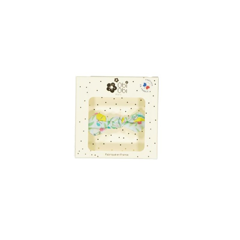 Jolie Barrette nœud entierement conçue et cousue en France- Motif "MESANGE" unique dessiné& imprimé en France. Packaging : boite cadeau dorée à l'or chaud (dimension : 9 X 9 X 1,5cm).