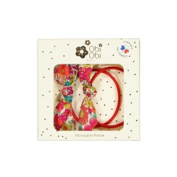 Lot de deux jolis nœuds en liberty Margaret Rose montés sur élastiques Entierement conçus et cousus en France- Modèle déposé à l’INPI Packaging : boite cadeau 9x9 dorée à l'or chaud . Fabrication française.