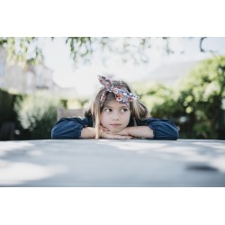 Bandeau adaptable à tous les tours de tete grâce à son élastique dans le cou et son nœud à nouer.